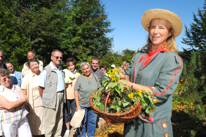 Kräuterfest im botanischen Garten Schellerhau Kräuterfrau Bruni Riemer mit Besuchern bei Kräuterwanderung durch den Garten Foto: Egbert Kamprath Veröffentlicht in Kräuterfrau Bruni Foto: Egbert Kamprath